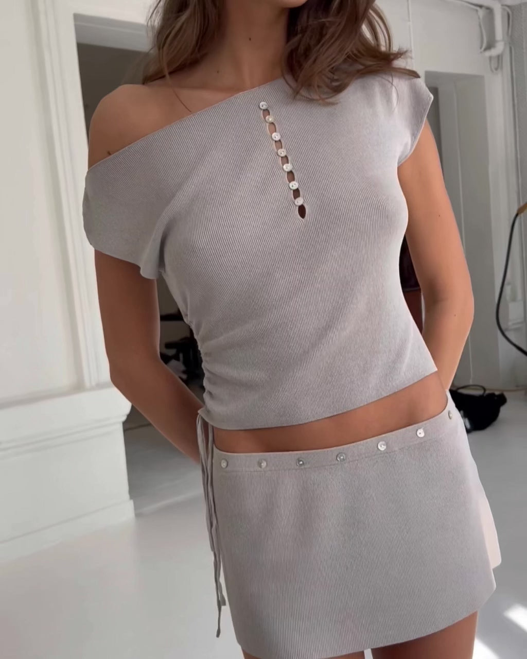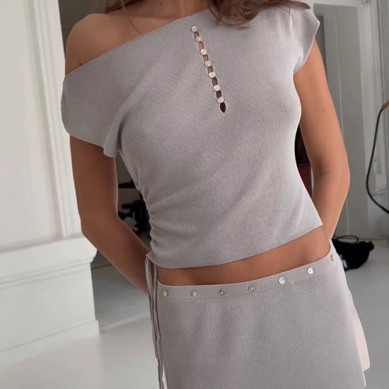 An elevated take on the classic mini. Crafted in a soft, fine knit, this skirt is designed to sit mid to low on the waist for a modern silhouette. Finished with a row of mother of pearl buttons along the waistband, it brings a subtle touch of luxury to an otherwise minimal piece.
